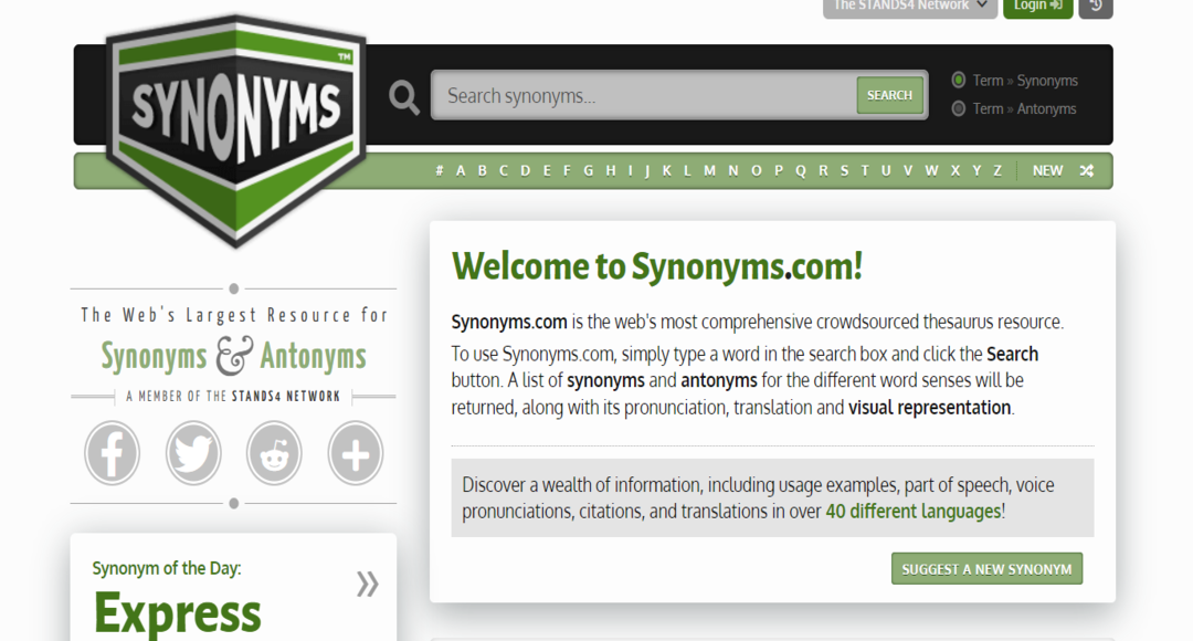 يعد موقع Synonyms أداة قيمة للباحثين عن مرادفات اللغة سواءً اللغة العربية أو اللغات الأجنبية، فالموقع غني بالمرادفات في مختلف اللغات.
