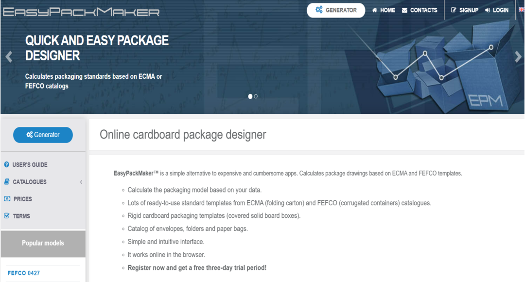 موقع EasyPackMaker هو أداة على الانترنت لتصميم التعبئة والتغليف من الورق المقوى حسب الطلب. وهو يتيح للمستخدمين اختيار أشكال مختلفة وفقا لمعايير إسما (علب قابلة للطي) و فيفكو (حاويات مضلع) ، لإنشاء تصميم التعبئة والتغليف دون استخدام البرمجيات المتخصصة. كما يتميز الموقع 3د النماذج التي تسمح لك بإنشاء الحالات, المغلفات, المجلدات وأكياس الورق. تم تصميم الموقع بطريقة سهلة الاستخدام ويمكن الوصول إليها مباشرة من متصفحك.