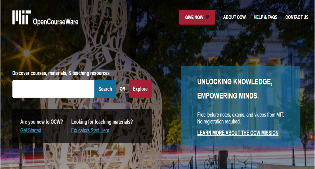 منصة MIT OpenCourseWare (OCW) إحدى منصات التعلم الذاتي التي توفر فرصة فريدة للتعلم واكتساب المعرفة من أرقى جامعات العالم دون الحاجة إلى السفر أو دفع رسوم للتعلم، فبإمكانك أن تتعلم من منزلك بالمجان.