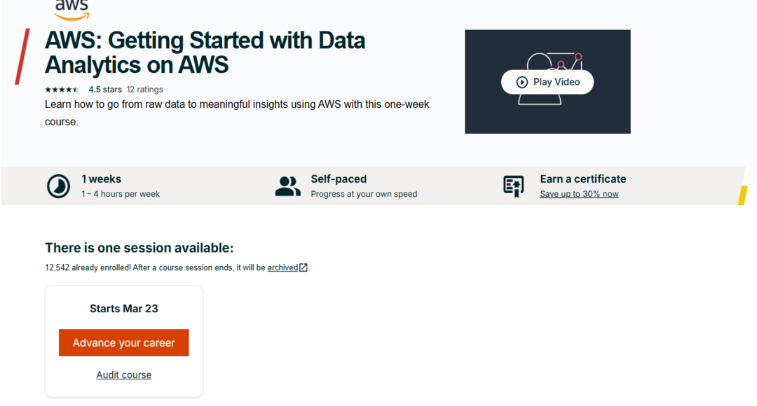 كورس البدء في استخدام تحليلات البيانات على AWS ، يهدف هذا الكورس المقدم من منصة edX إلى تعريف المبتدئين بمفاهيم تحليلات البيانات الأساسية وكيفية استخدام خدمات AWS لبناء حلول تحليلات بيانات قوية.