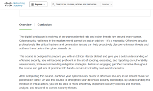 تقدم سيسكو دورة تدريبية متخصصة في هذا المجال، تهدف إلى تزويد المتدربين بالمعرفة والمهارات اللازمة لاختبار الأنظمة والشبكات بحثًا عن نقاط الضعف، ولكن بشكل قانوني وأخلاقي.
