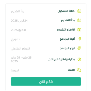 5 – الحضور والمشاركة من المهم الالتزام بالحضور والمشاركة الفعّالة في جميع أيام الدورة للاستفادة القصوى، وقد يمنح المشاركون شهادة إتمام بعد انتهاء البرنامج بنجاح.