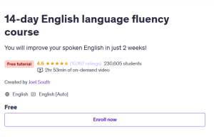 دورة “الطلاقة في اللغة الإنجليزية خلال 14 يومًا” على منصة Udemy هي واحدة من الخيارات الممتازة لمن يرغب في تحسين مهارات التحدث باللغة الإنجليزية بطريقة سريعة وعملية. يقدم هذه الدورة المدرس الأسترالي “Joel South”، الذي يمتلك خبرة طويلة في تدريس الإنجليزية كلغة أجنبية منذ عام 2009.