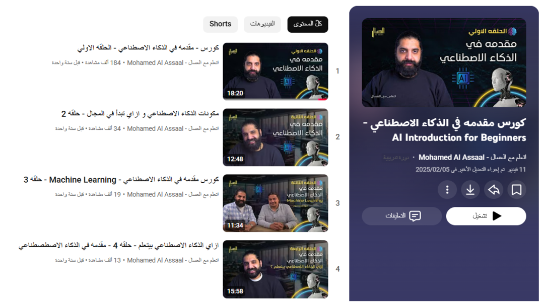 يقدم الأستاذ محمد العسال عبر قناته التعليمية المعروفة، كورس مقدمة في الذكاء الاصطناعي – AI Introduction for Beginners