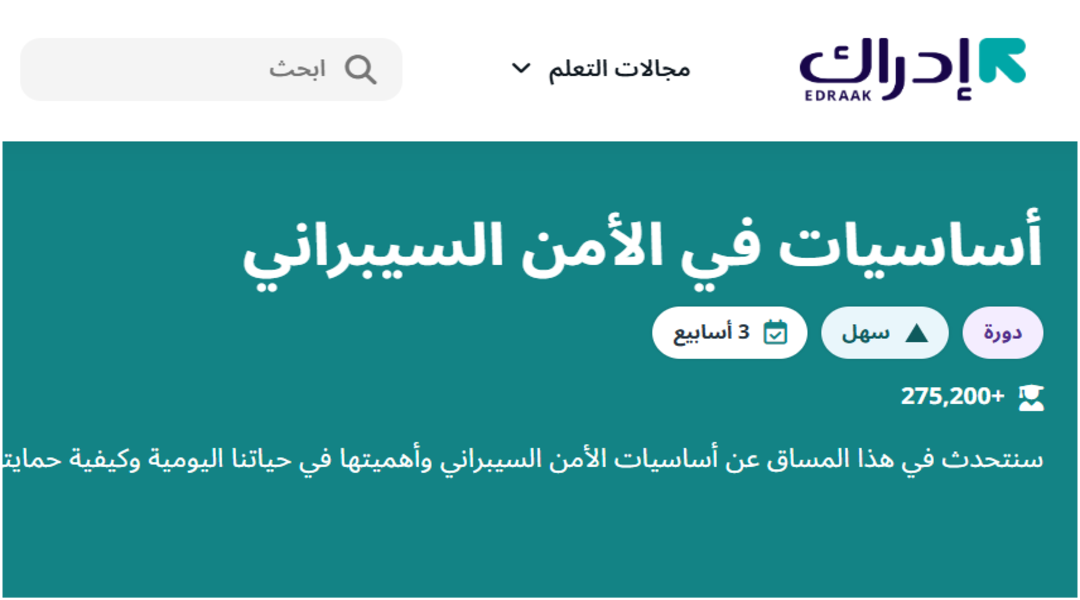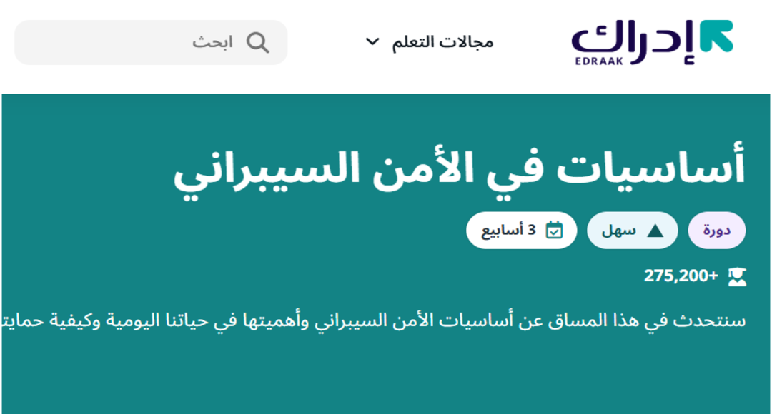 دورة أساسيات الأمن السيبراني من إدراك هي مساق تعليمي مجاني يُقدَّم باللغة العربية، ويهدف إلى تعريف المتعلم بالمفاهيم الأساسية للأمن السيبراني. تركّز الدورة على بناء الوعي الرقمي وفهم المخاطر الشائعة التي تهدد الأفراد والمؤسسات عند استخدام الإنترنت والأنظمة الرقمية. صُمم محتوى الدورة ليكون واضحًا وسهل الفهم، مما يجعلها مناسبة تمامًا لمن ليست لديهم خلفية تقنية متقدمة.