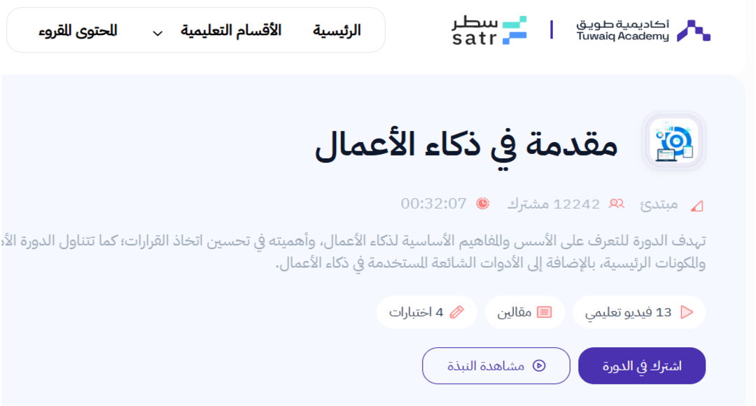 تعد دورة مقدمة في ذكاء الأعمال من أكاديمية طويق عبر منصة سطر واحدة