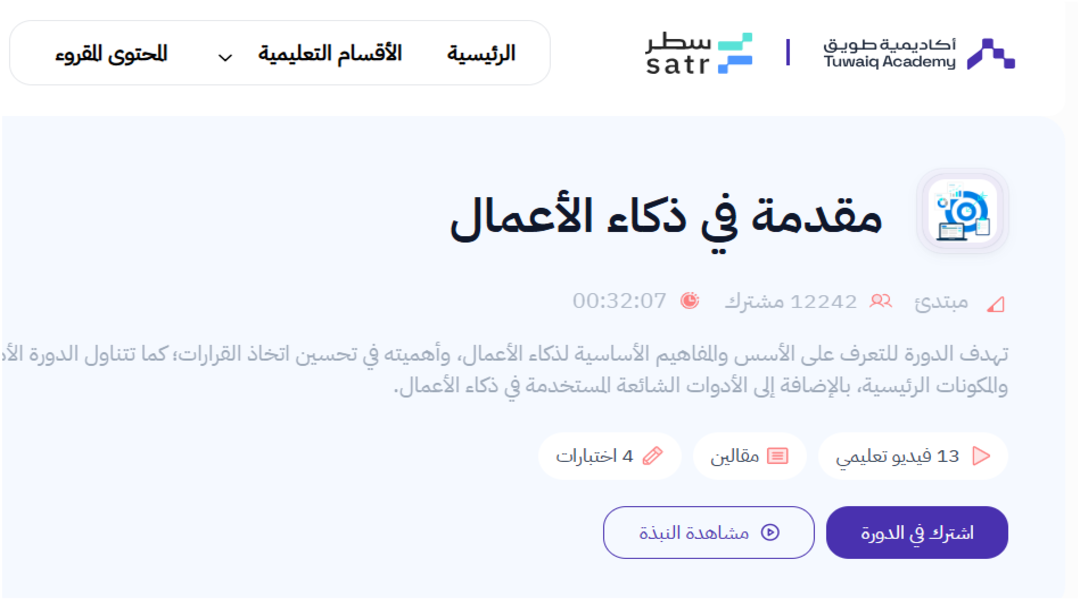 للتسجيل في الدورة، توجه إلى منصة سطر التابعة لأكاديمية طويق، ثم قم بإنشاء حساب جديد أو تسجيل الدخول إذا كان لديك حساب مسبق. بعد ذلك ابحث عن دورة مقدمة في ذكاء الأعمال، ادخل على صفحة الدورة، واضغط على زر التسجيل لبدء التعلم مباشرة والاستفادة من المحتوى المتاح