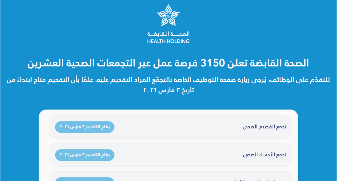يبدأ التقديم على وظائف الصحة القابضة اعتبارًا من 3 مارس 2026، وذلك عبر بوابات التوظيف الخاصة بكل تجمع صحي على حدة. ويُشترط على المتقدمين متابعة الإعلانات الرسمية لكل تجمع للتعرف على التفاصيل الدقيقة المتعلقة بالشروط والمتطلبات وآلية التقديم.