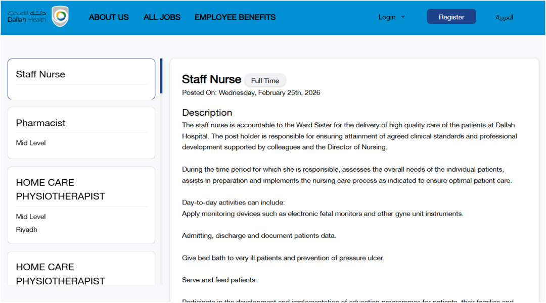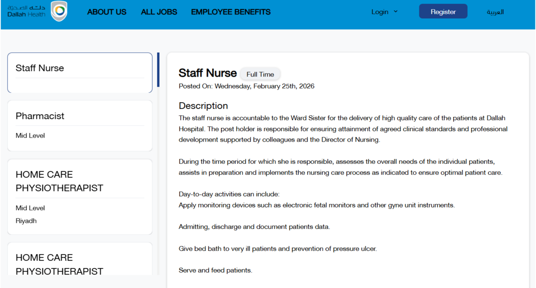 في النهاية، إذا كنت تبحث عن مستشفى دلة الصحية فرص وظيفية في الرياض، فإن الخطوة الصحيحة هي زيارة صفحة التوظيف الرسمية، الاطلاع على المسميات المتاحة، والتقديم على الوظيفة التي تتوافق مع مؤهلاتك وخبراتك، مع التأكد من إدخال البيانات بدقة لضمان وصول طلبك بشكل صحيح.