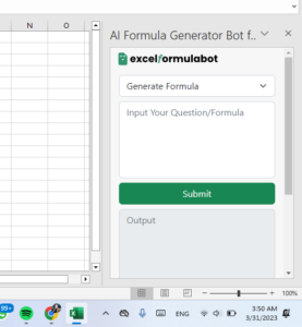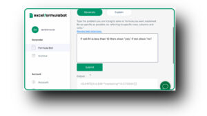 ومن ثم ستظهر لك واجهة المستخدم لـ Excel Formula Bot، والتي يمكن من خلالها إدخال المتغيرات والعمليات الحسابية وغيرها من المعلومات باستخدام اللغة الطبيعية والتعرف على النص، وتوفير الصيغ الجاهزة للاستخدام. يمكنك أيضًا استخدام Excel Formula Bot لإنشاء رسوم بيانية وجداول بيانات متقدمة بسهولة.