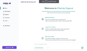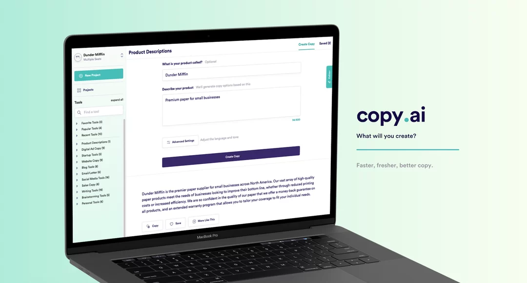 موقع Copy ai ، هي أداة كتابة بالذكاء الاصطناعي تساعدك على إنشاء نسخة تسويقية عالية الجودة ووصف المنتج ومحتوى موقع الويب والمزيد. يستخدم الذكاء الاصطناعي لإنشاء نص ملائم وجذاب ومقنع.