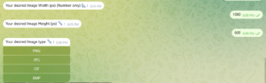 4 – سيرسل البوت بعد ذلك سؤال حجم العرض الخاص بالصورة وستجاوب بالرقم ومن ثم سؤال عن حجم الطول وستجاوب ، كما في الصورة واخيرا اختر صيغة الصورة وسيتم الإرسال :